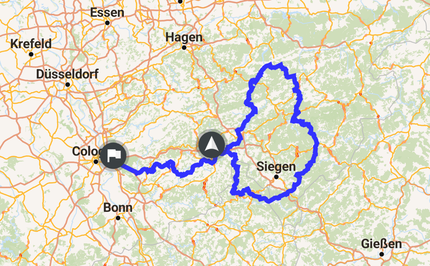 Von Köln aus über A4 bis Abfahrt Bergneustadt und dort die Rundtour von ca 245 km erstellt. Kurz vor der Vollendung der Runde angehalten und Zielpunkt auf die Heimat gelegt und über Land nach Hause gefahren. Hat sehr gut geklappt. Meiner Meinung nach sind die Straßenverhältnisse in MK und HSK besser als im Bergischen Land. Zumindest hat sich das auf dieser Tour so gezeigt.