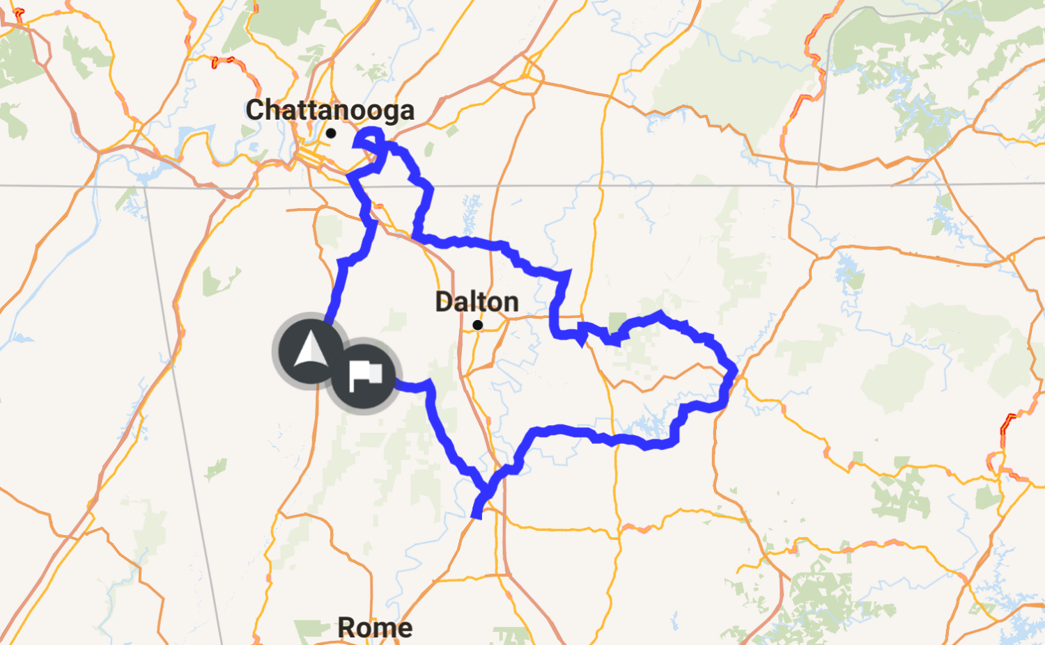 Ignore the first part of the ride. Went out for breakfast in Chattanooga. But getting down towards South Ringgold and hitting GA 52/2, you get high quality technical roads with beautiful scenery combined. That is the main draw to this ride. 136 across the Ridge between Lafayette-Dalton is a twisty, high speed, uphill rush that will get the bike over 30°+ on every corner.