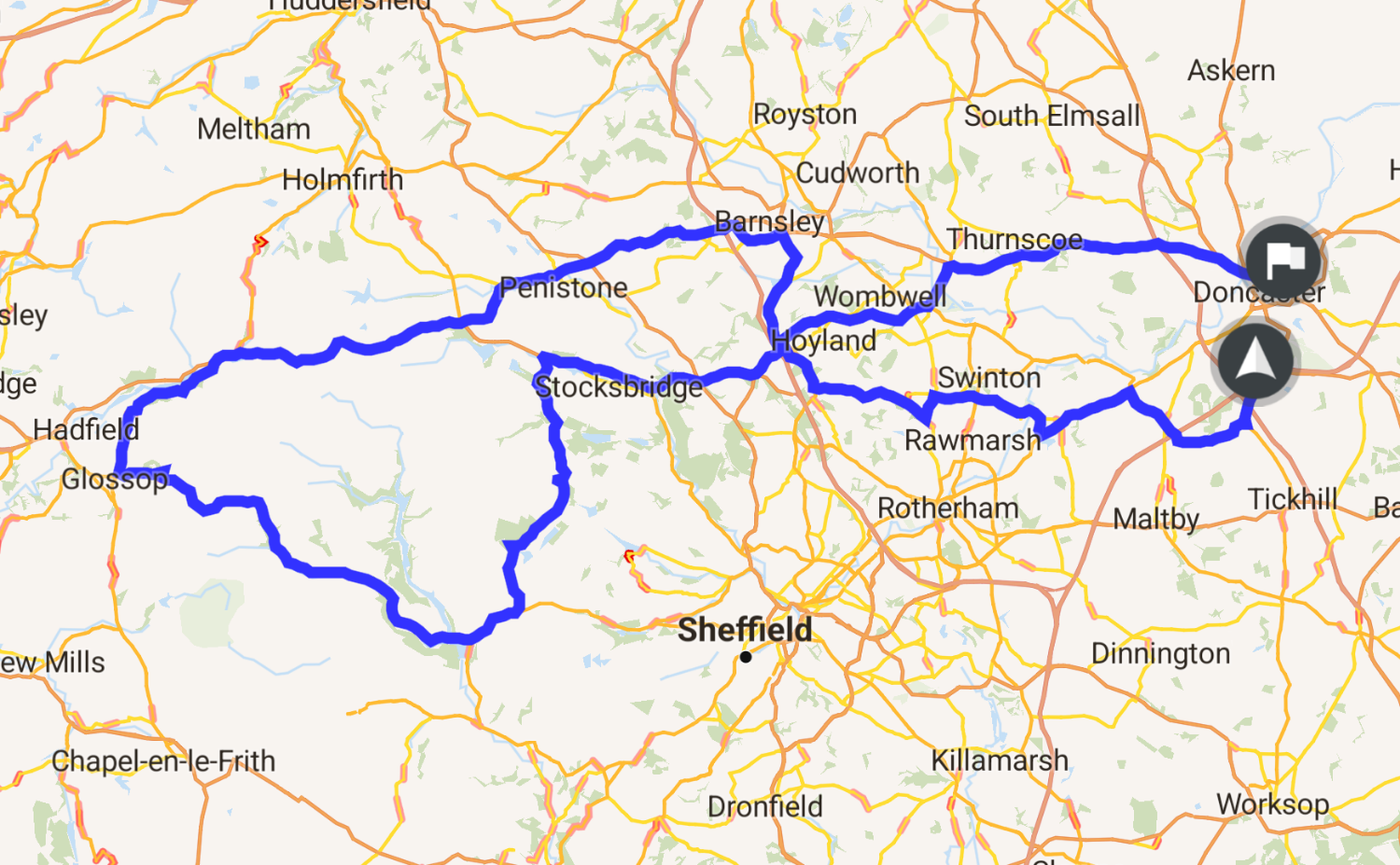 Beautiful ride out to the Peaks from Doncaster. Through Wentworth to Penistone and the Woodhead Pass to Woodhead Reservoir. Then a cheeky road over to Glossop before heading back on Snake Pass. Finally across Strines Moor and back past Wombwell and Marr.