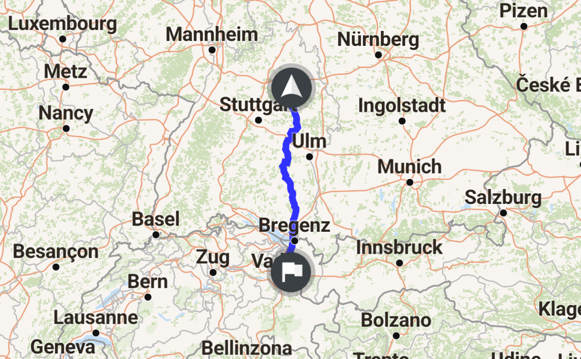 Anreise für meine Alpentour über die "Schwäbische Alb", den Bodensee in den Vorarlberg. Die letzten 100 km ab Bad Waldsee hatte es immer wieder geregnet bzw. gewittert.